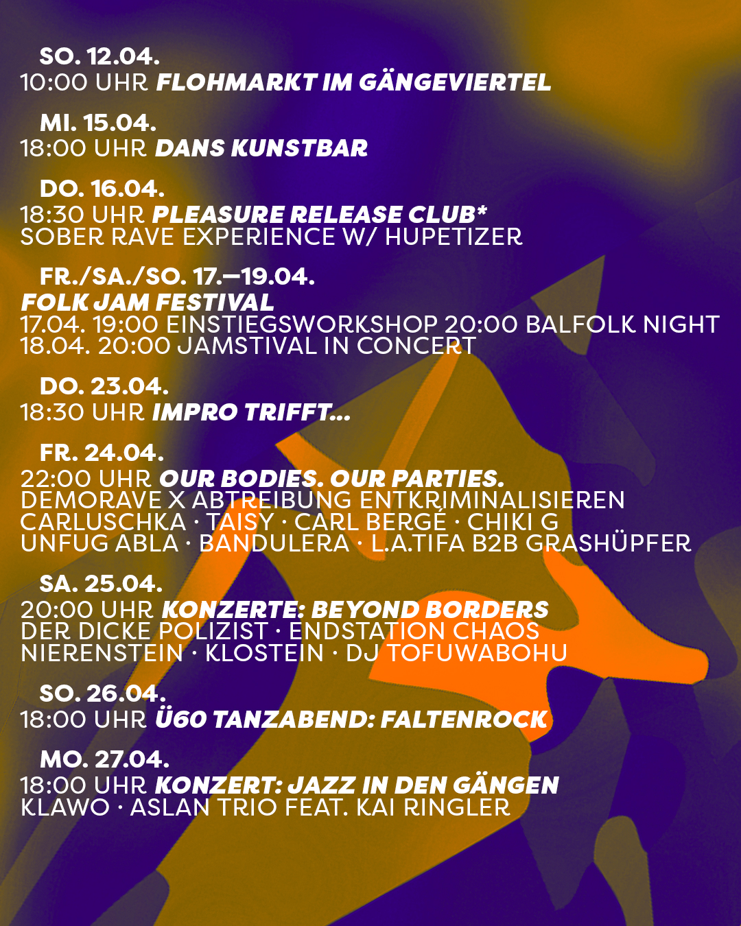 Besser spät als nie! Das komplette Monatsprogramm für die Fabrique (bzw. den Saal) im Gängeviertel.