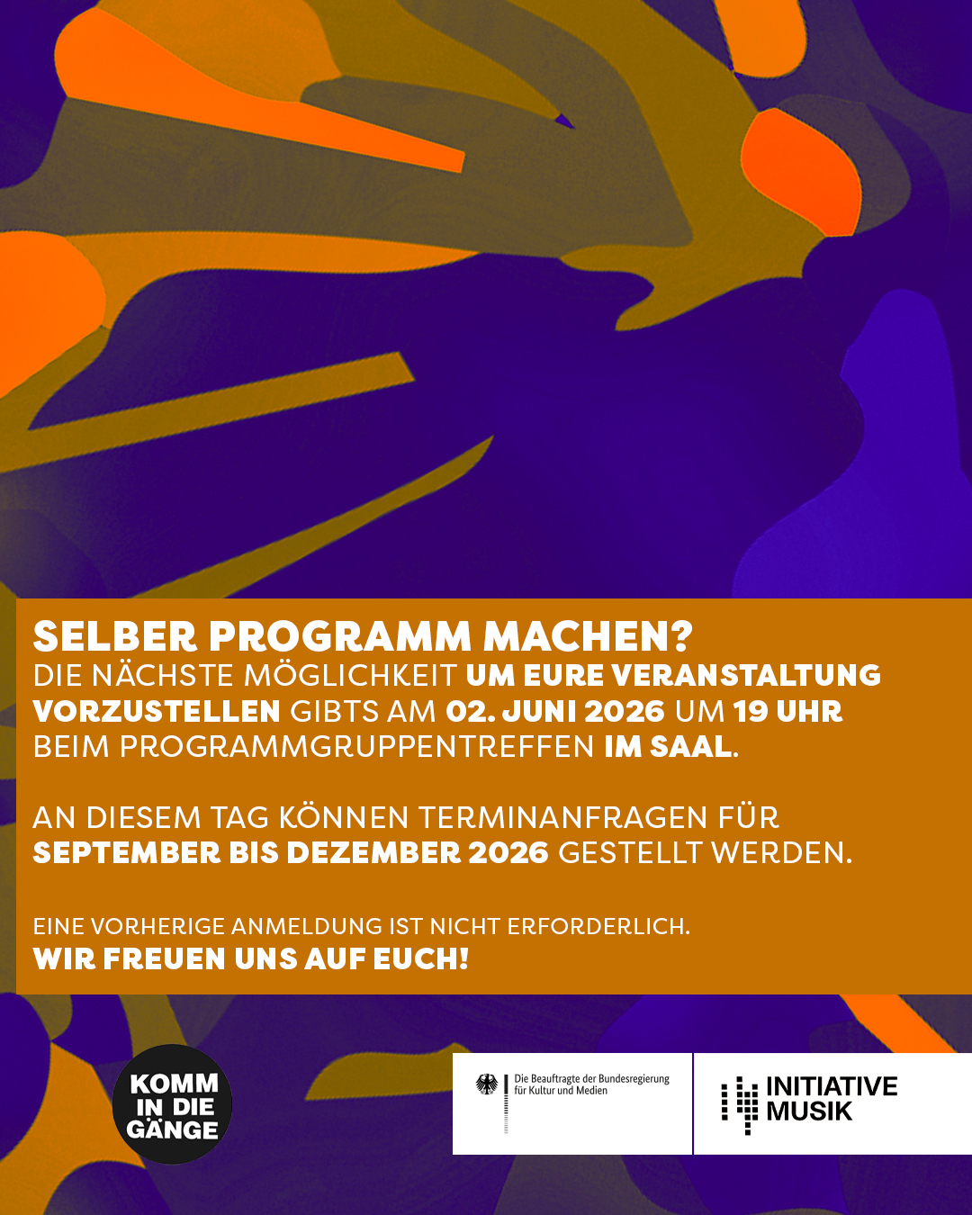 Einfach vorbeikommen, Programm vorstellen, Räume besichtigen, Fragen stellen und Wunschtermine auswählen — wir melden uns dann innerhalb einiger Wochen und teilen euch mit, ob wir euch einen Termin zuweisen können.