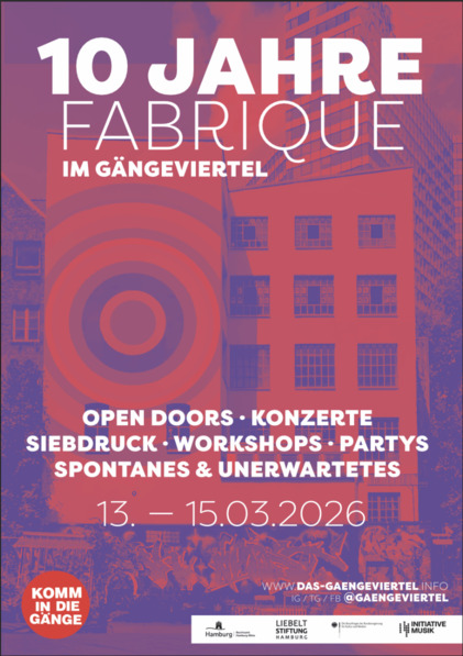 Während im Erdgeschoss die Nebelmaschine für die nächste Party warmläuft, drückt in der Etage darüber bunte Farbe durchs Sieb auf Demobanner. Nebenan sendet ein Freier Radiosender sein Programm. Darunter dampfen Kichererbsen und Okra-Schoten auf den Tellern. In zwei Räumen probt die freie Tanz- und Theaterszene. Unterm Dach trifft sich die Comicbibliothek. An welchem Ort steht dieses Haus? Mitten im Gängeviertel! Die Fabrique feiert im März 2026 zehnjähriges Jubiläum.