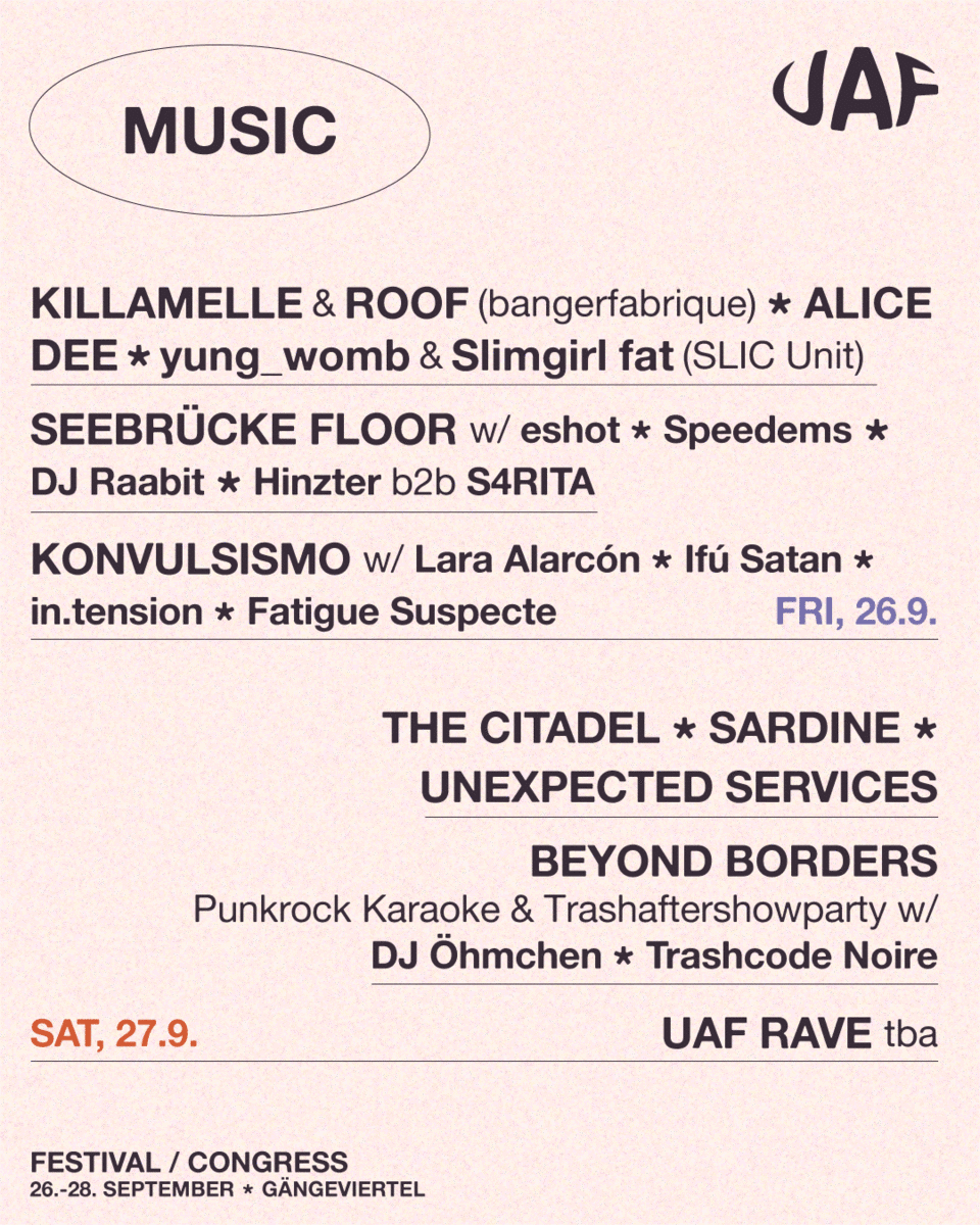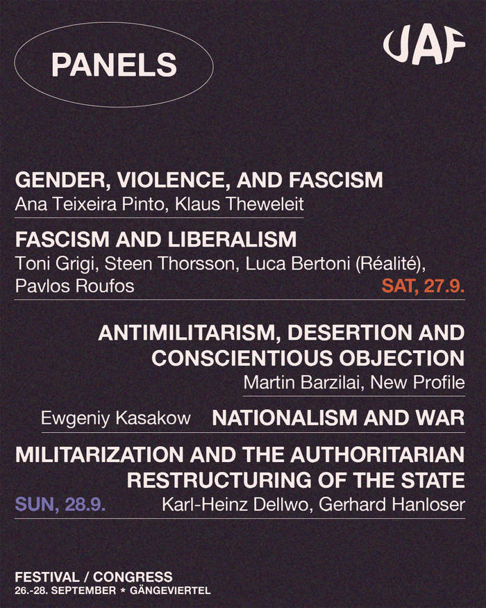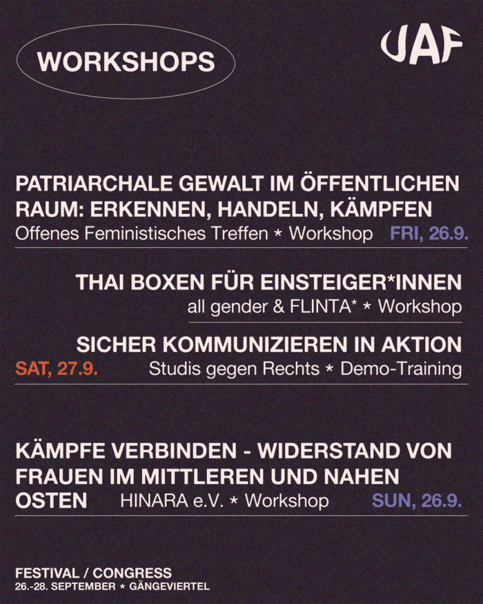 Gemeinsam wollen wir im Rahmen des UAF einen Ort der Vernetzung und des Austauschs schaffen, der sich aus mehreren Perspektiven mit dem Thema Faschismus auseinandersetzt, mit Panels, Workshops, Musik, Party, Kunst und mehr.