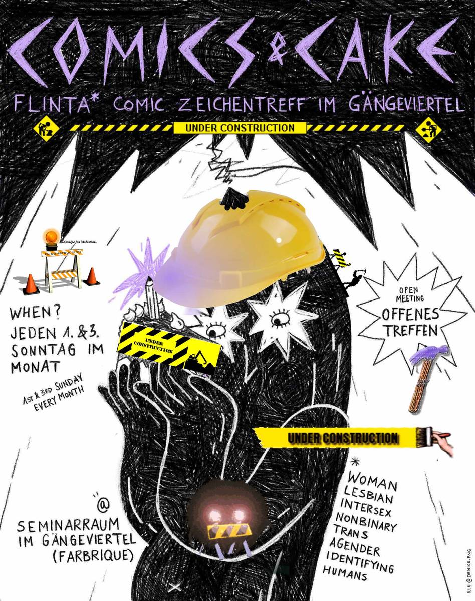 Der FLINTA*-Zeichentreff comicsandcake hat lange Zeit über im Gängeviertel stattgefunden. Leider ist das Ganze jetzt im letzten Jahr etwas eingeschlafen. Einige Personen haben aber weiterhin richtig Lust, dass es ein regelmäßiges offenes feministisches Format im Gängeviertel gibt – und auch, das zum Beispiel mit Zeichnen, Comics, Plakate designen, Zines zusammenkopieren oder Kuchen essen zu verbinden!