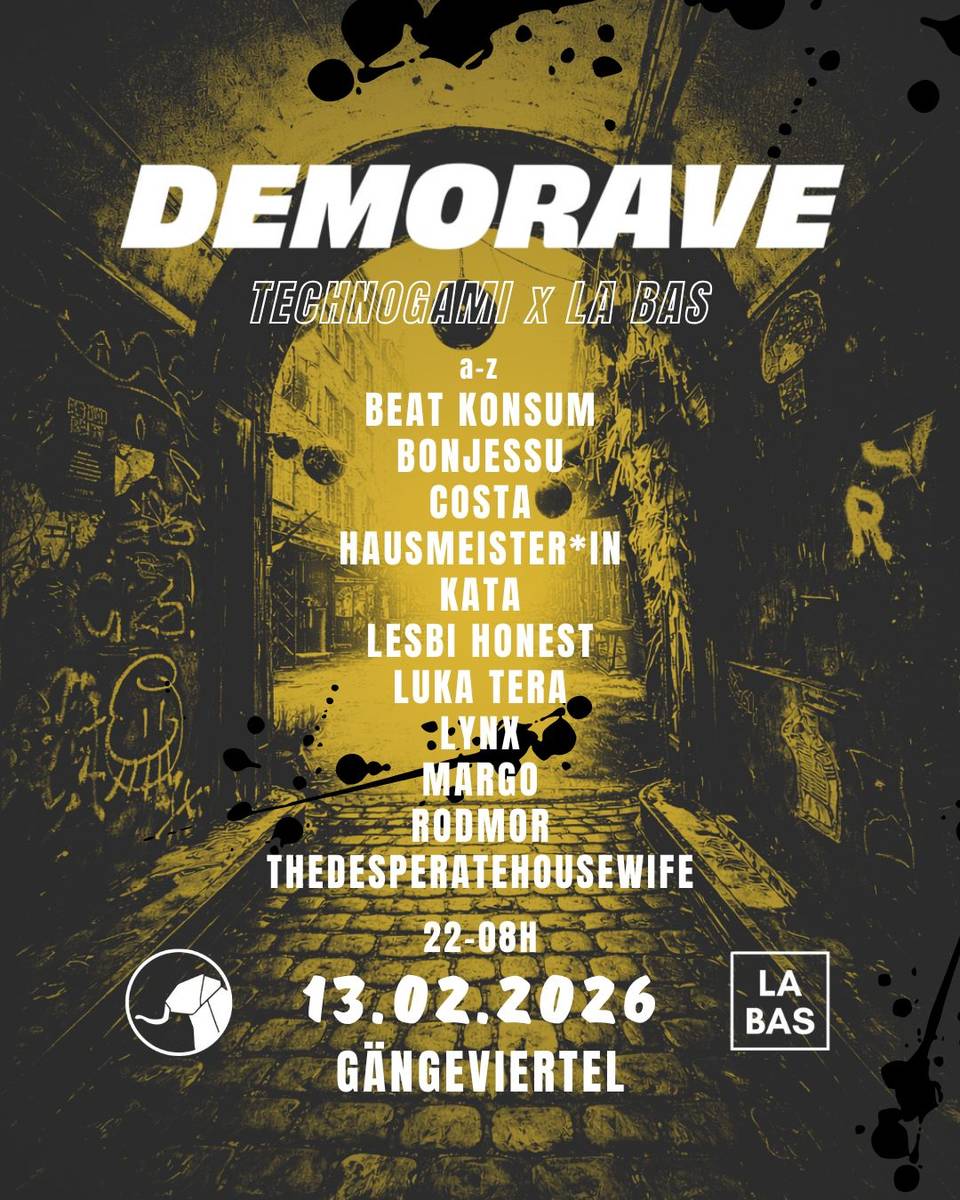 The next Demorave Clubnight is coming, hosted by Technogami & La Bas.