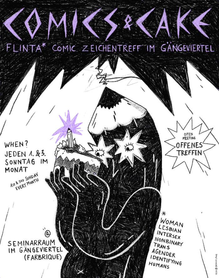 Wir laden ein zu Comics & Cake, dem FLINTA* Comic-Zeichen-Treff im Gängeviertel! Wir treffen uns, um gemeinsam oder nebeneinander an Comics, Illustrationen, Zines, und anderem visuellen Krams zu arbeiten. Wir wollen uns in einem feministischen, ungezwungen und möglichst sicheren Rahmen austauschen, voneinander lernen und auszuprobieren. Darüber hinaus bietet es sich gegebenenfalls an gemeinsamen Projekte zu planen, wie: Zines, DIY Workshops, Ausstellungen, …